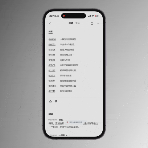 在硬件端完成了錄音的工作之後,咱們就可以打開 Plaud 配套的手機 App,找到這條錄音,然後稍微等一會,Plaud 就會給這條錄音自動轉寫成文字,同時利用AI進行總結、提煉和歸納。