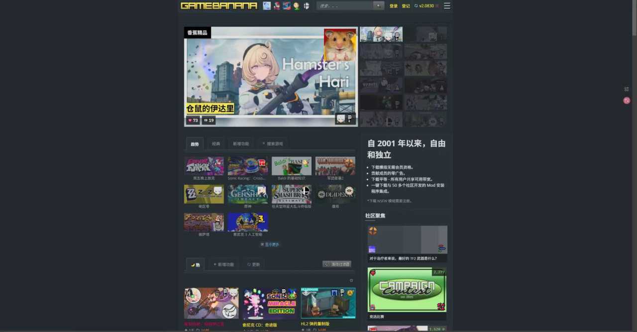 香蕉网,主要集中于二次元模组,如原神,鸣潮,绝区零等,还有军团要塞2,V社的新游deadlock等