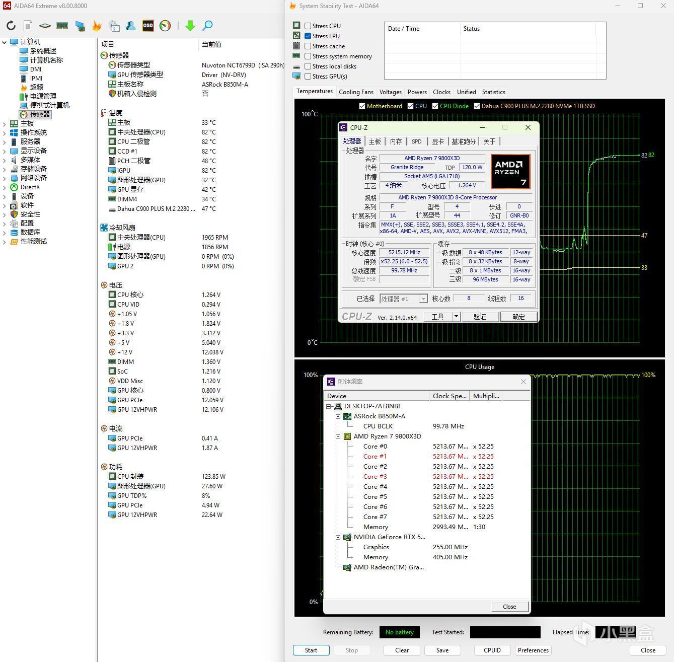▼简单跑个CPU-Z的压力测试,处理器功耗在130W左右,全核心睿频5.3GHz左右,温度82℃。