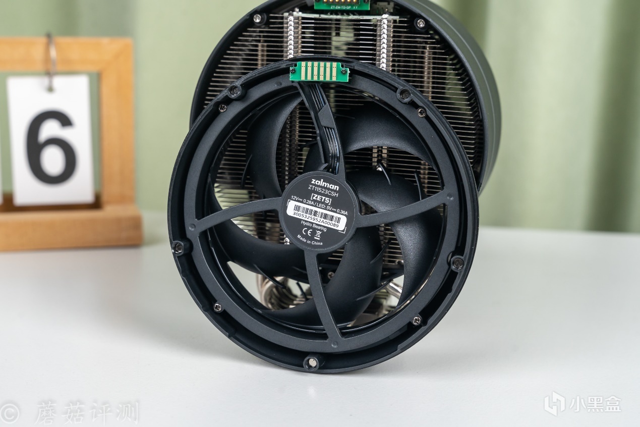 ▼散热风扇的背面设计也非常不错,顶部还有一块PCB,表面有铜制触点,用于风扇供电和灯效同步。
