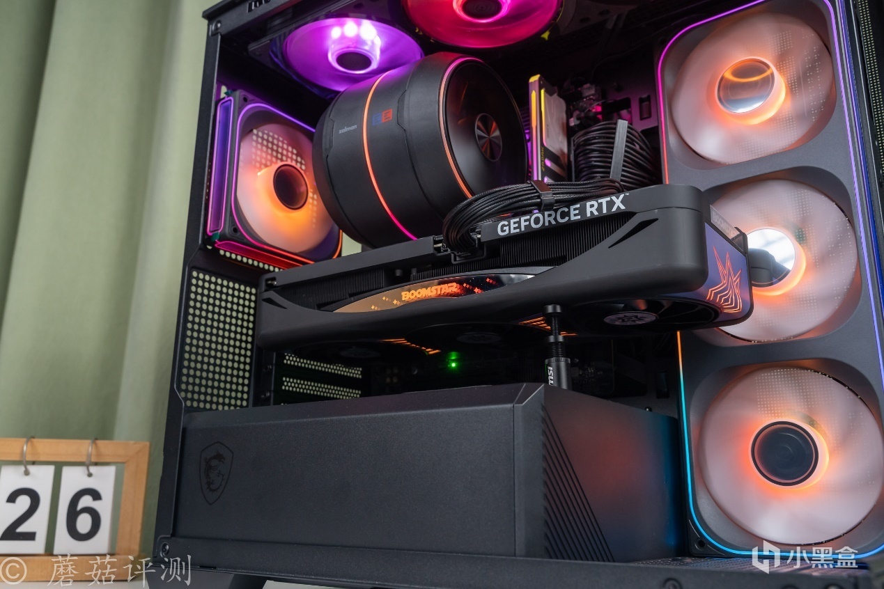 ▼显卡用的是影驰的RTX 5080星曜NOX,显卡的背面标配镜面背板,搭配这款风冷散热,还能在显卡的背板上有一些光影效果。