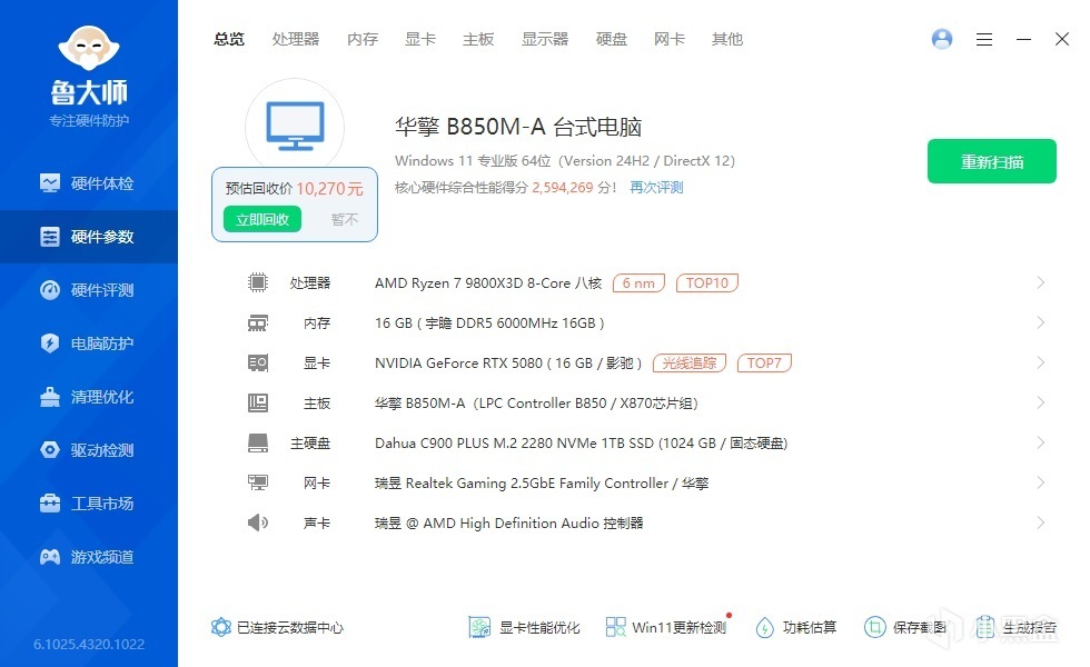 ▼整机配置一览,处理器是9800X3D,显卡是影驰的RTX 5080星曜NOX,整机配置很不错。