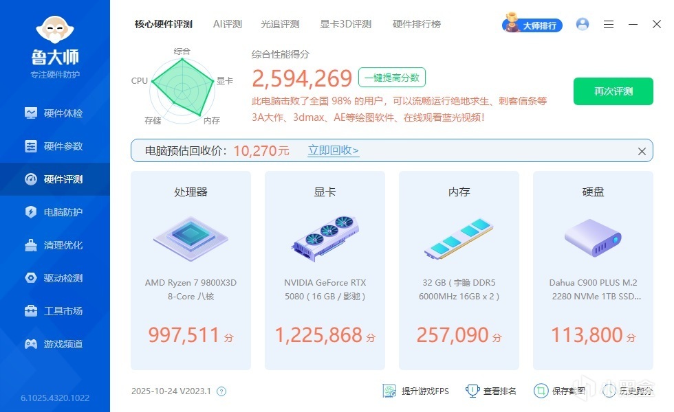 ▼简单跑个整机测试,整机得分259.4W,分数很高。