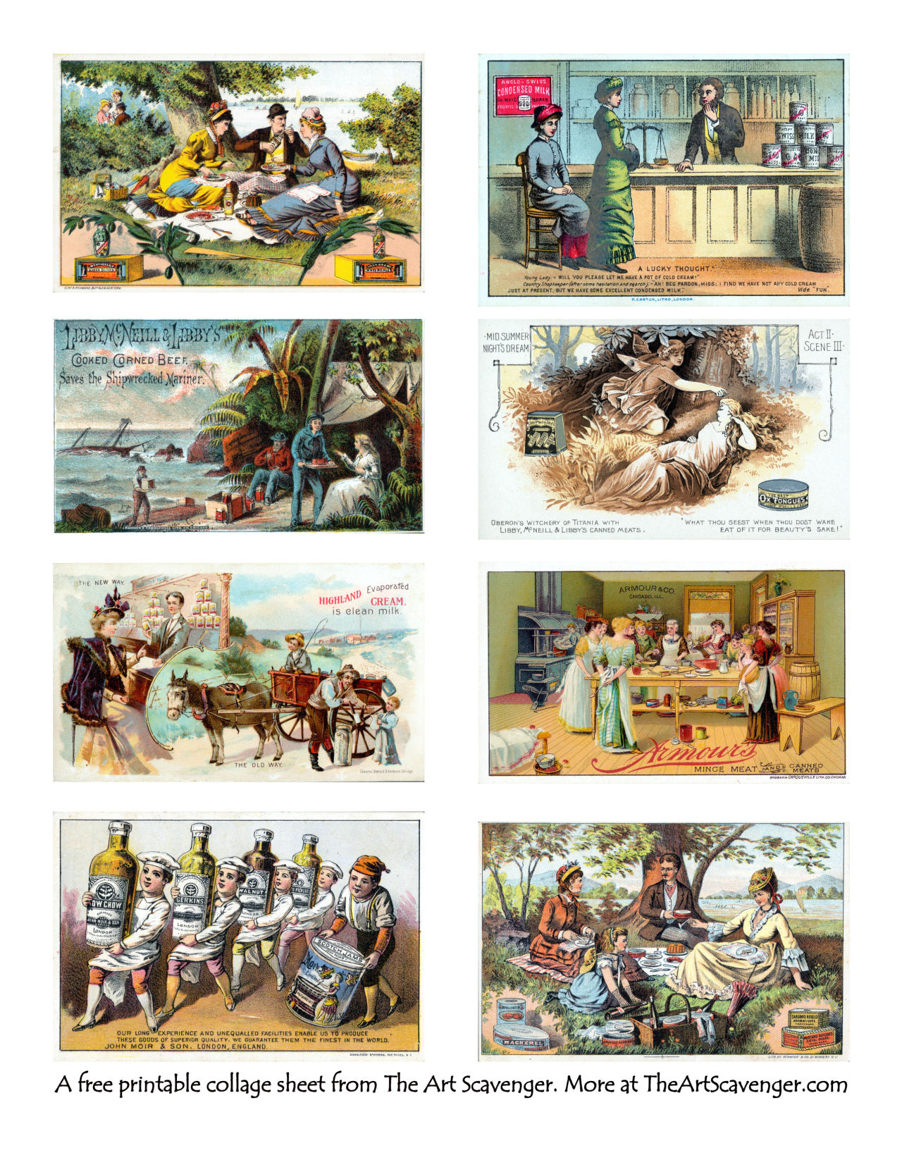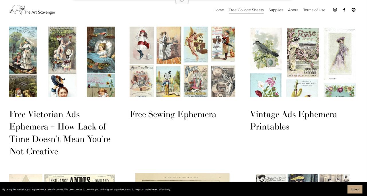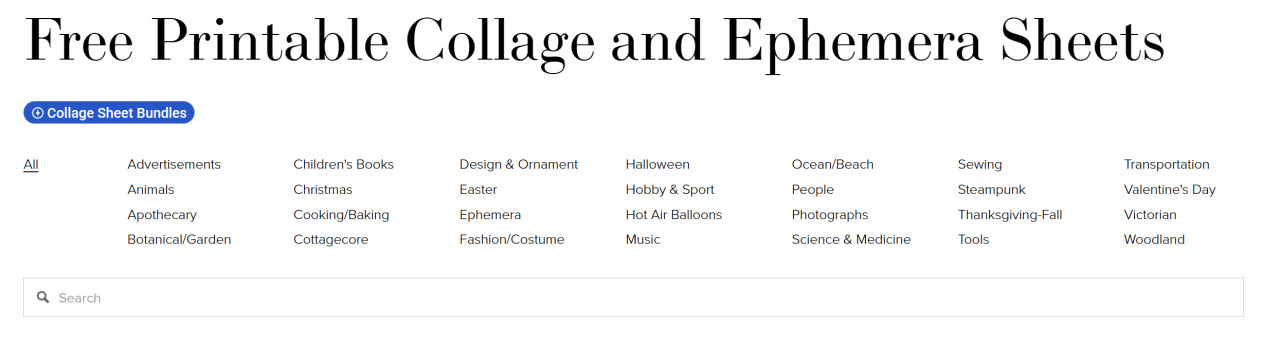 这个网站的核心功能是提供“拼贴素材页”(Collage Sheets) 和 “复古纸品”(Ephemera) 的免费下载。