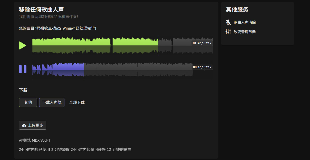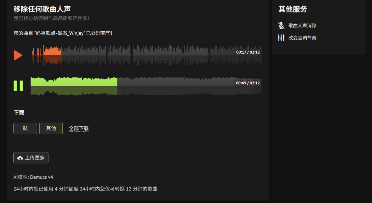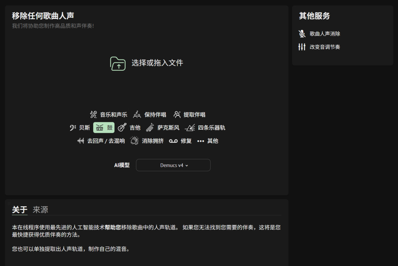 非常强大的AI音频处理网站,它的核心功能是音轨分离,也就是俗称的歌曲人声提取或伴奏提取。