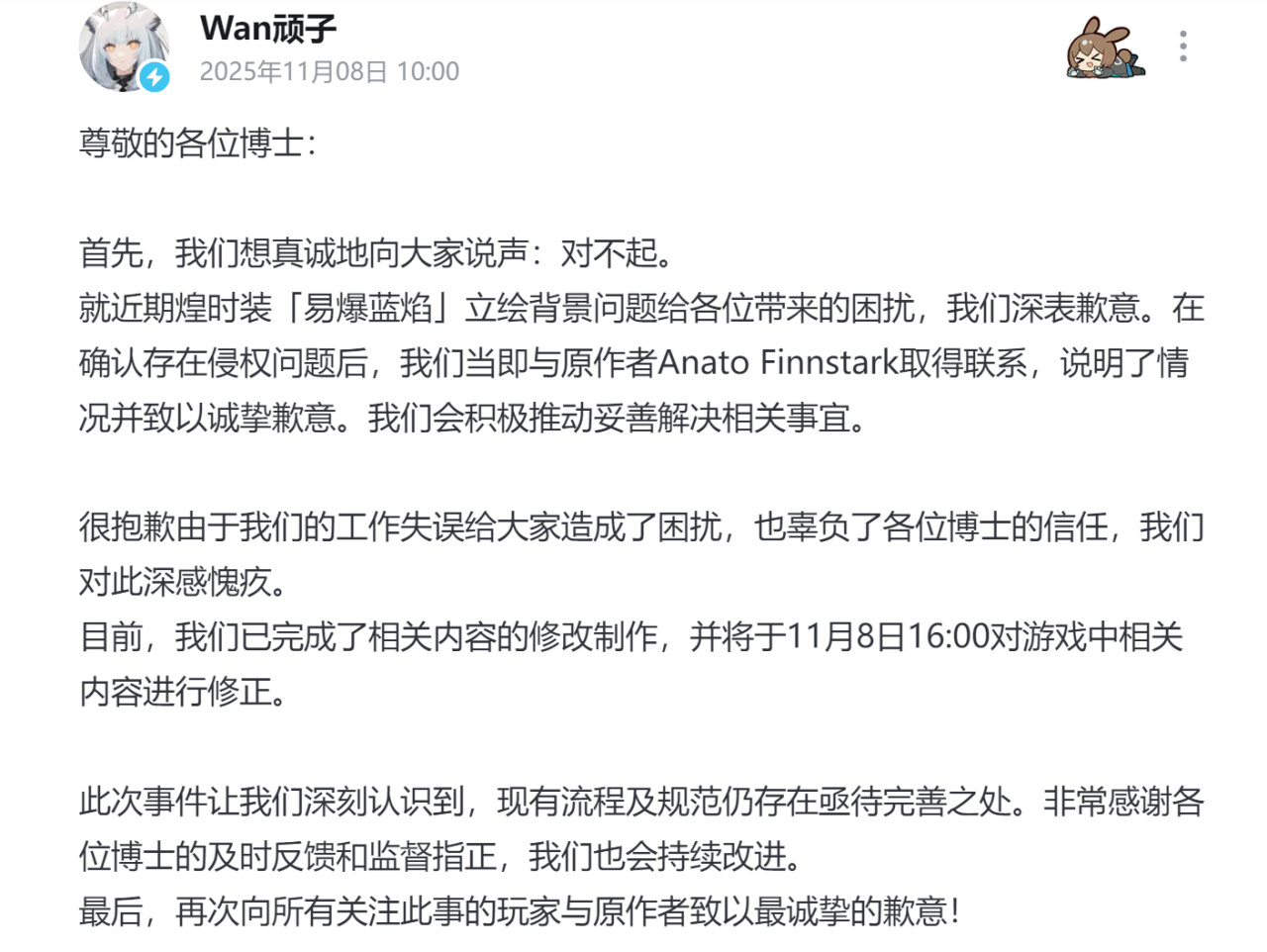 很抱歉由于我们的工作失误给大家造成了困扰,也辜负了各位博士的信任,我们对此深感愧疚。 目前,我们已完成了相关内容的修改制作,并将于11月8日16:00对游戏中相关内容进行修正。
