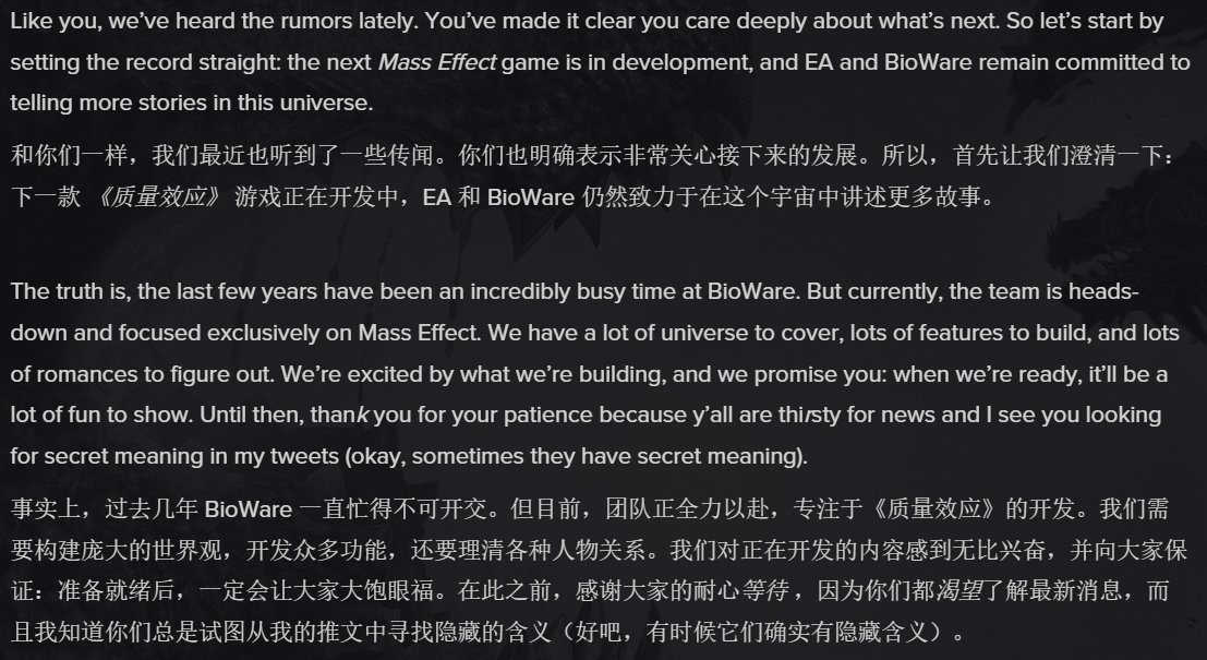 甘布尔在博客中感谢《质量效应》社区持续支持,称BioWare当前工作凝聚着激情与坚持。"新一代《质量效应》游戏正在开发中,EA与BioWare始终致力于拓展这个宇宙的叙事,"他写道。针对近期玩家猜测,甘布尔表示虽暂未公开细节,但团队正全力投入科幻传奇新篇章的构建。"我们需要呈现广阔宇宙、打造丰富功能、设计多元浪漫关系,"此番暗示彰显作品在叙事与情感维度上的宏大野心。