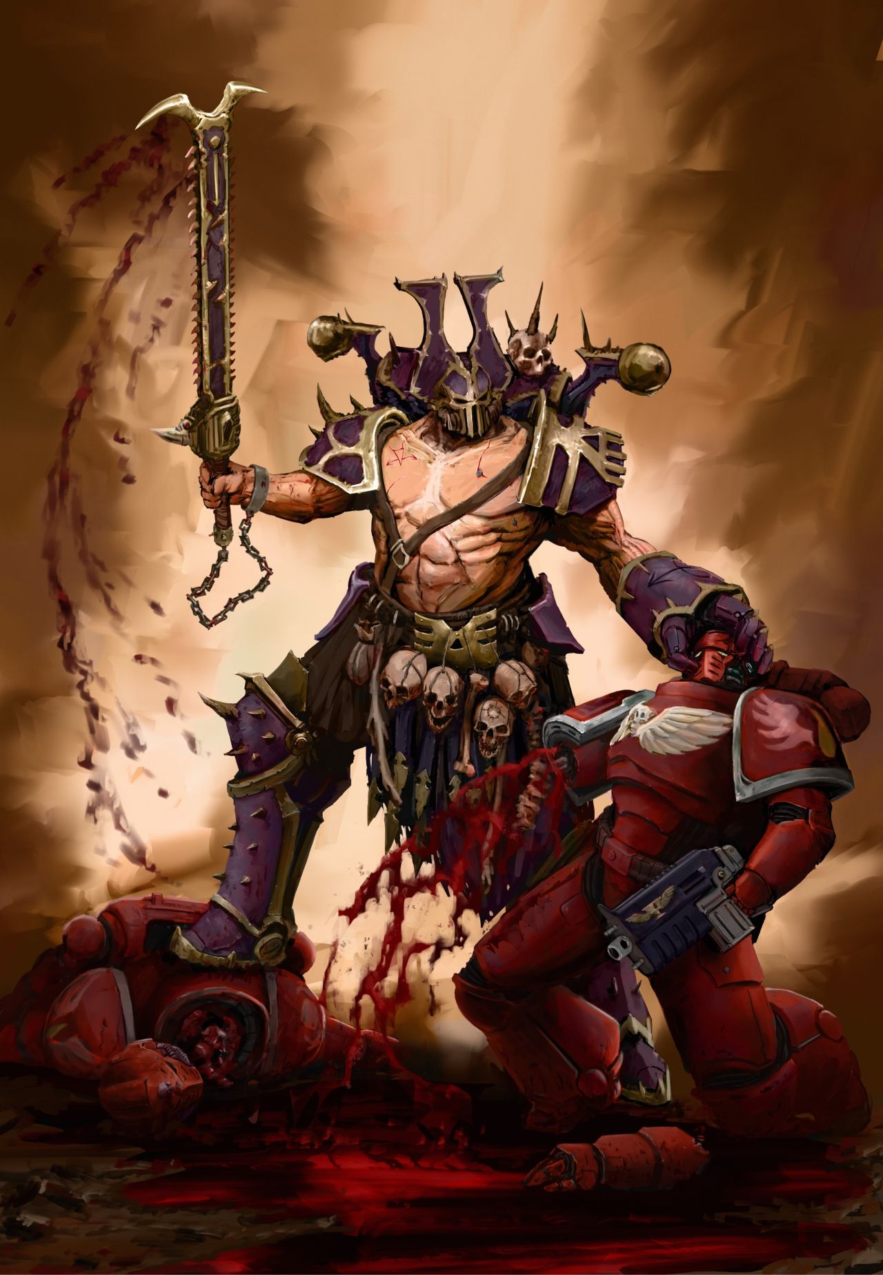 歷經數百場戰鬥,他的甲冑早已被燻黑;這名殘虐的戰士接受了鮮血之神所賜的一切。爲更強烈地感受戰鬥的狂潮,他脫下裝甲,在被腐化的軀體上以儀式刻下疤痕。他殺戮時所展現的狡智與兇猛,甚至連那些被“屠夫之釘”折磨的古老吞世者兄弟們,都難以想象。