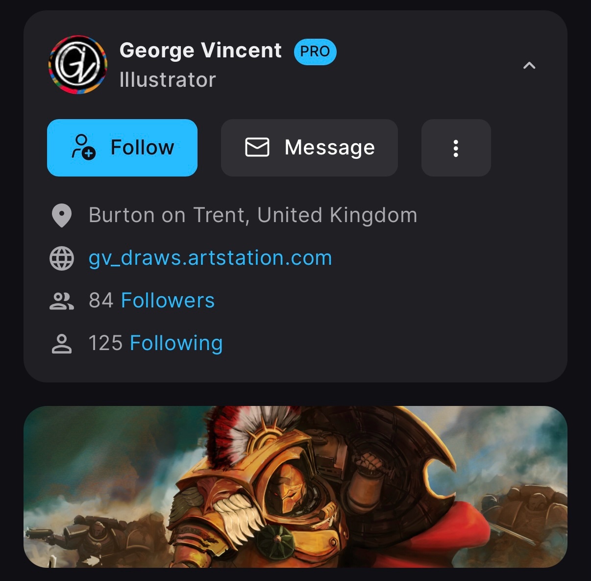 本期要介紹的這位作者是 George Vincent,George 常駐英國伯頓(Burton-on-Trent),是一位專注奇幻/科幻題材的插畫師。看他的作品就知道,他不是那種只堆細節的畫家:他先把剪影、光比和體塊立穩,再用金屬邊緣高光、披風與羽冠的節奏把主角托出來,背景則用青灰的體積煙塵壓遠景,讓金紅角色在前景“發光”。這種處理,特別適合書封、戰棋世界觀的主視覺和關鍵幀。