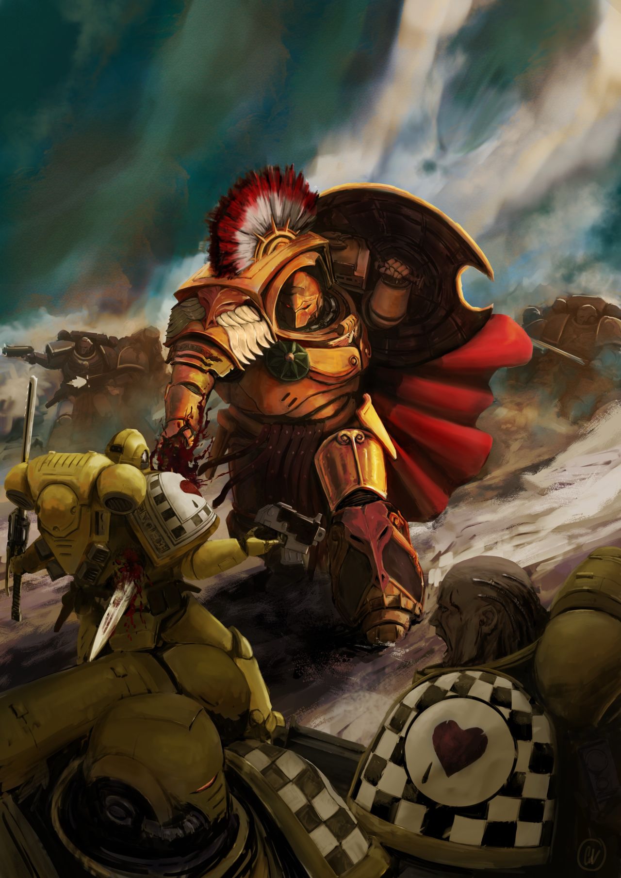 這幅作品是在學習Paul Dainton與Jamie Martinez的風格與技法,因此有些姿勢看上去會讓人感到熟悉。主要是一次在畫面構成與渲染上的練習。更重要的是,是送給作者摯友的一份禮物——他自創的戰團名爲白顱。這幅畫也用來紀念作者在重新回坑之後,彼此軍隊在桌上交鋒的那些時刻。