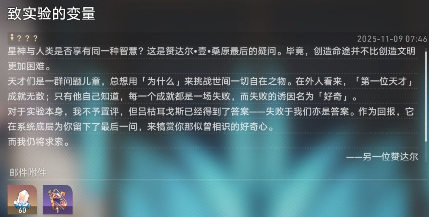對於實驗本身,我不予置評,但呂枯耳戈斯已經得到了答案——失敗於我們亦是答案。作爲回報,它在系統底層爲你留下了最後一問,來犒賞你那似曾相識的好奇心。