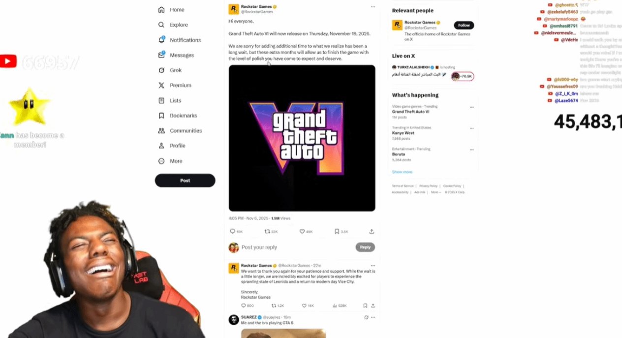 消息公布后,知名Youtube主播“甲亢哥”IShowSpeed在直播中情绪失控。他崩溃大叫:“等这游戏发售时我都50岁了!我都娶妻生子了!甚至还养了猫狗!等这游戏发售时,我都完完全全成为另一个人了!” 这段直播片段迅速在社交媒体传播,引发玩家共鸣。此外有网友表示《GTA5》发售时甲亢哥才八岁,R星让所有人等的太久了!