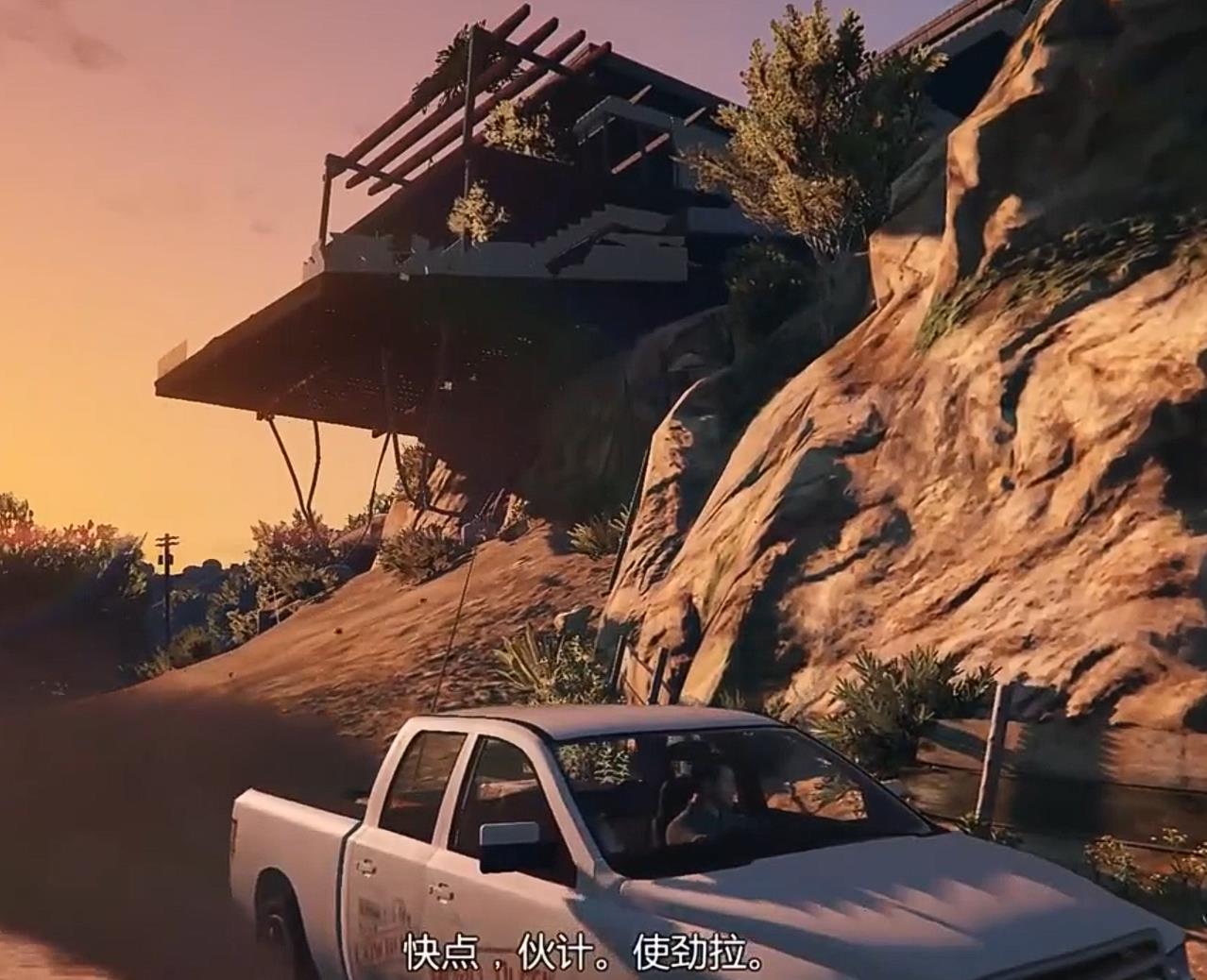 该任务中拉夫提到:“洛圣都这个地方不太稳定,可能上一分钟你还有个不错的房子,结果下一分钟就被人用卡车把房子露台拽掉了。”——暗示故事模式麦克。