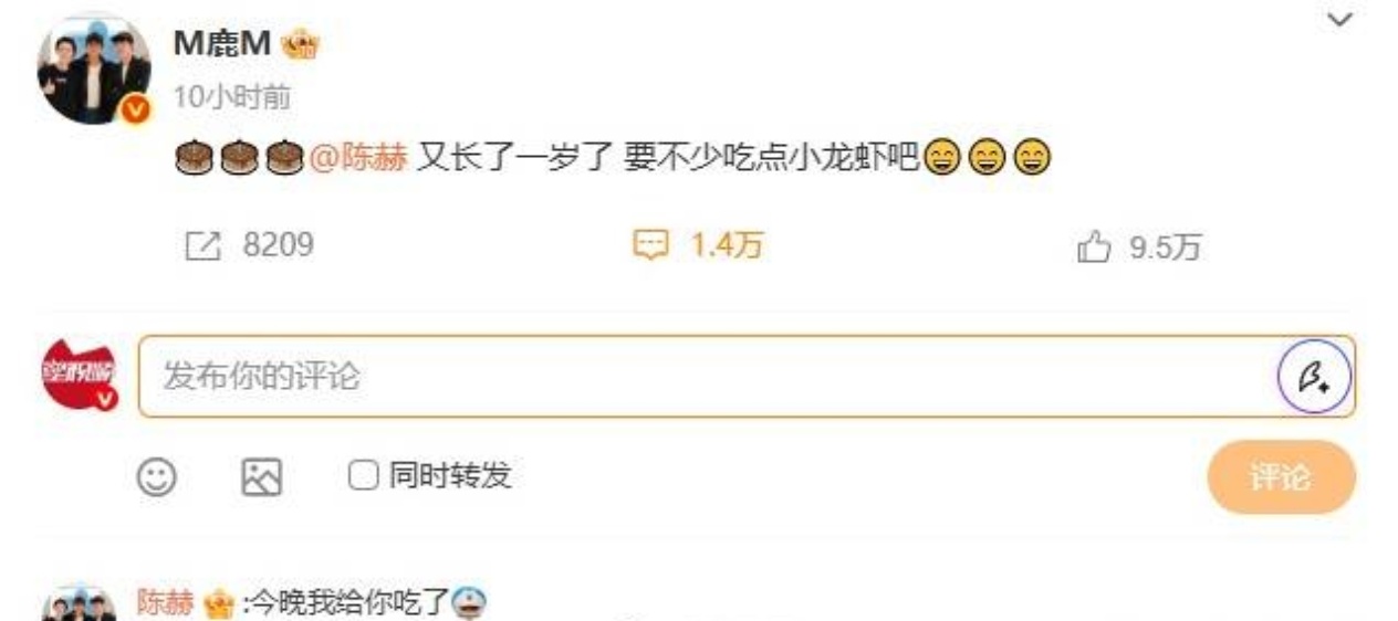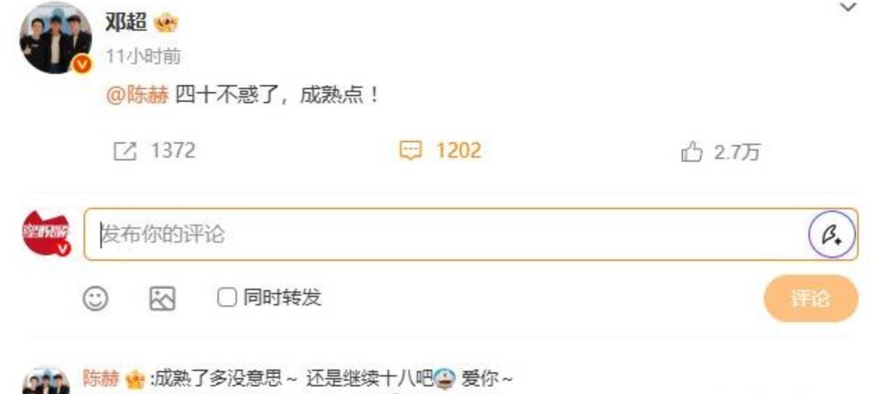 陳赫在評論區幽默回應:“數了半天”,並打趣道“讓我擁抱你一下~”。此外,鄧超、鹿晗和范志毅也紛紛發文慶賀。鄧超寫道“四十不惑了,成熟點”,而鹿晗則調侃“要不少喫點小龍蝦吧”,展現了他們之間深厚的友誼和默契。陳赫因在《愛情公寓》中飾演“曾小賢”一角而走紅,2014年作爲固定嘉賓參加《奔跑吧兄弟》後人氣持續攀升。