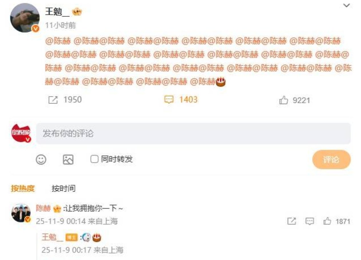 11月9日,演員陳赫迎來40歲生日,衆多好友在社交媒體上爲他送上祝福。歌手王勉在凌晨發佈特別慶生帖,連續艾特陳赫賬號40次,以對應其不惑之年的特殊意義。