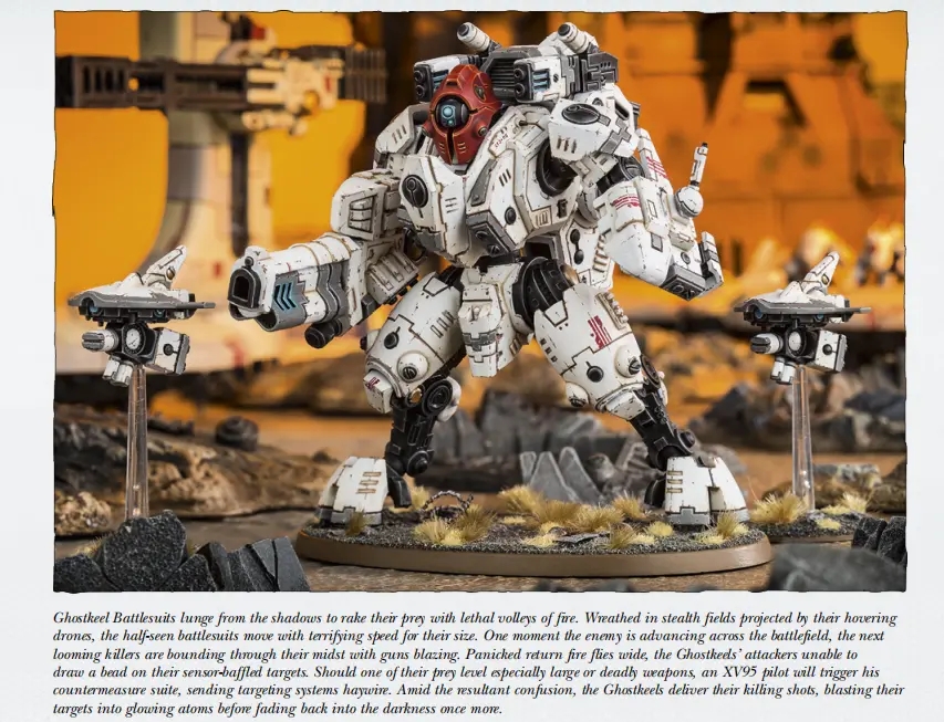 在恩德拉斯幽鬼的防御战中,XV95小队利用隐形立场渗透至混沌星际战士后方,以离子速射炮精准消灭敌方重武器小组,全程未被雷达探测到。