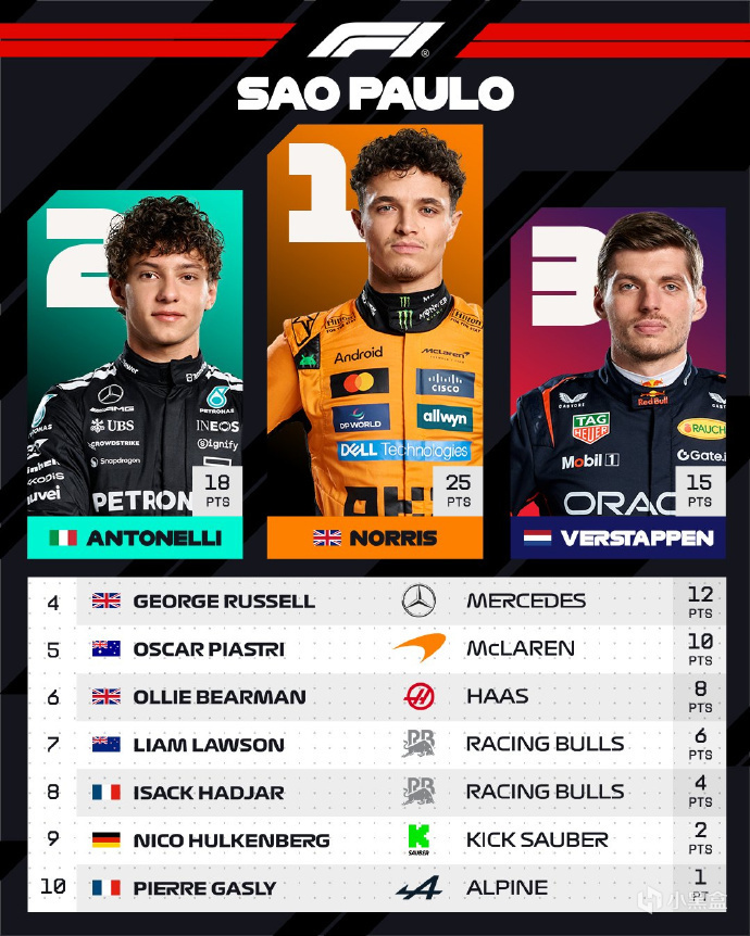 2025年11月10日,F1大獎賽來到了南美的巴西聖保羅大獎賽!本週,安東內利表現非常亮眼,諾里斯拿下衝刺賽頭名和杆位,而維斯塔潘則是Q1就被淘汰!正賽,樂扣遭遇無妄之災因皮亞和安東內利的碰撞導致退賽,老漢同樣退賽,維斯塔潘維修區起步,三停一路追到P3,安東內利完美拿到第二,拉塞爾第四,皮亞第五,第六到第十爲貝爾曼、勞森、哈賈爾、霍肯博格和加斯利!