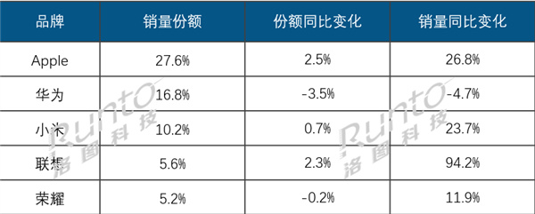 線上銷量TOP5品牌榜單正式揭曉,蘋果、華爲、小米(含紅米)、聯想、榮耀穩居前列。