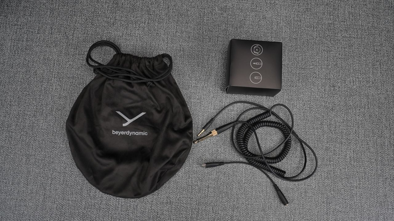 拜亞標準樣式的黑橙包裝,抽開後即是耳機本體以及配件,一個絨布收納袋,一條配線與type-C的轉接頭,配線做了電話線式盤繞的防拽設計,最長可延展至3米,與它樸實無華的外觀共同表明了這臺機器的工具屬性