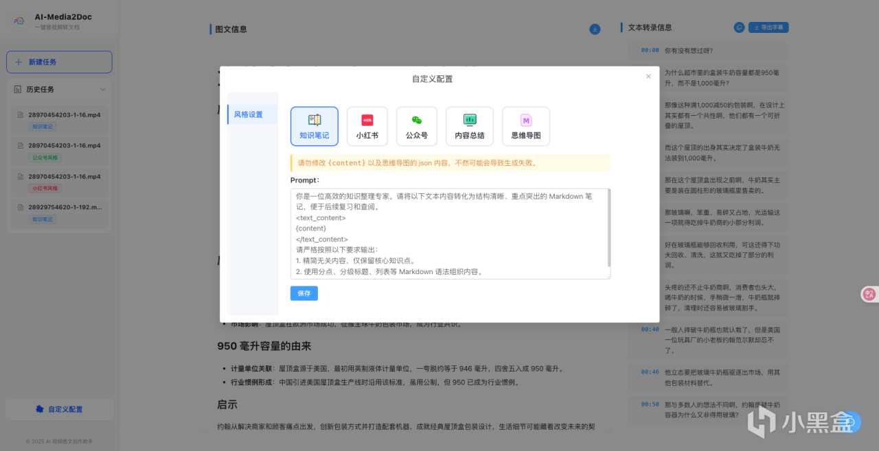 多种文档风格——支持小红书、公众号、知识笔记、思维导图、内容总结等多种风格。