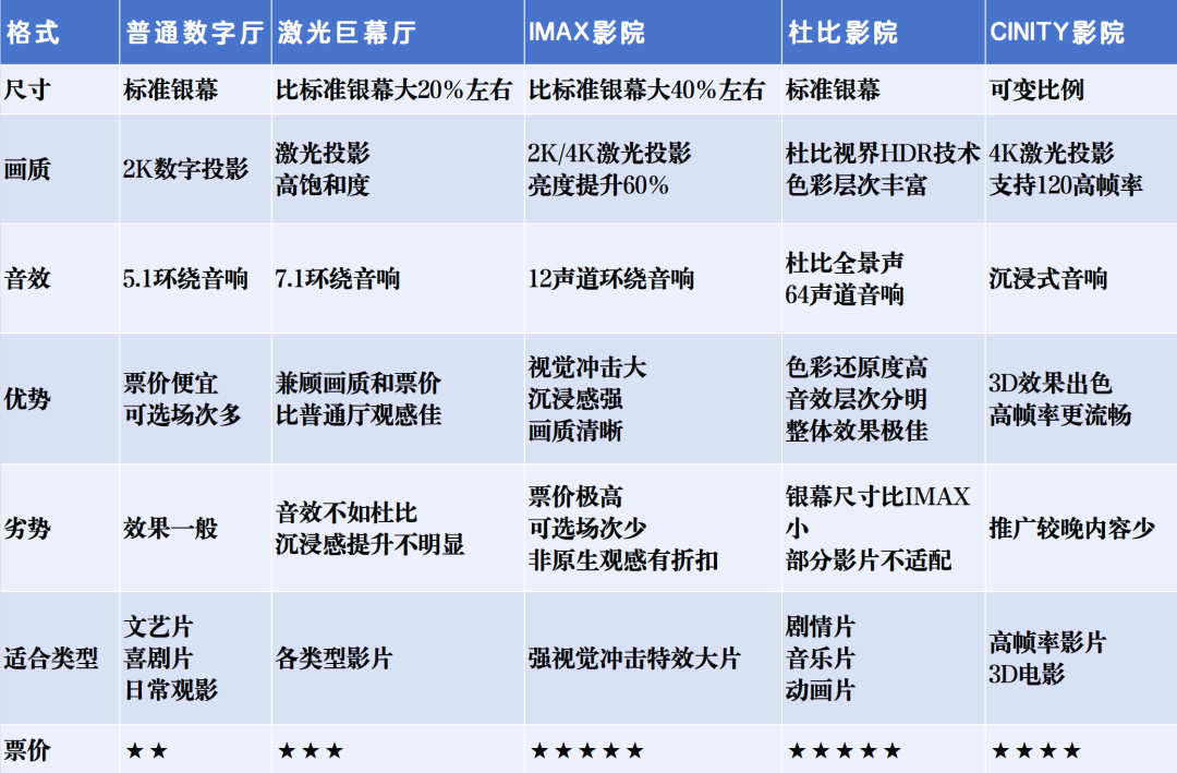 追求低票價或對畫質要求不高的劇情片、喜劇片等可以考慮購買普通數字影廳;激光巨幕則是大屏幕體驗的平價選擇。
