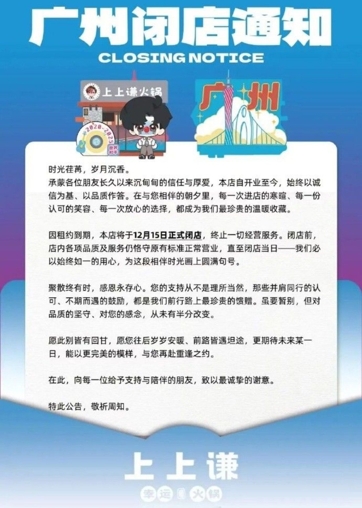 近日,上上謙火鍋通過微信公衆號發佈閉店通知,宣佈其廣州店因租約到期將於12月15日正式關閉。此後,該品牌全國門店僅剩上海南京東路店一家在運營。