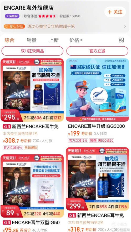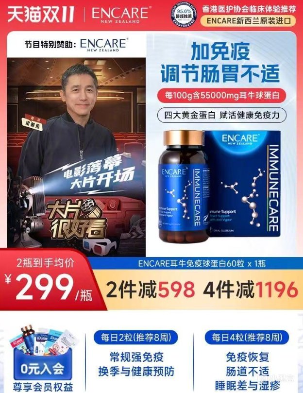 刘嘉玲晒出的两张截图显示,涉事店铺为 “ENCARE 海外旗舰店”(目前应该是搜不到了),店铺带有 “天猫国际” 标识,其售卖的一款售价 200 多元的 “新西兰 ENCARE 耳牛免疫球蛋白” 保健品,在商品首页显眼位置使用了梁朝伟的半身照片。