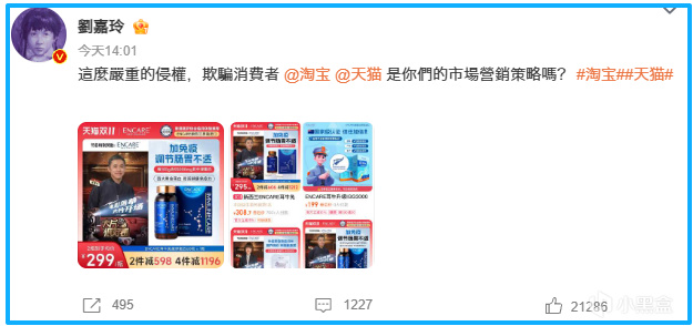 针对此次疑似侵权行为,刘嘉玲直接喊话淘宝、天猫官方:“这么严重的侵权,欺骗消费者,是你们的市场营销策略吗?”。