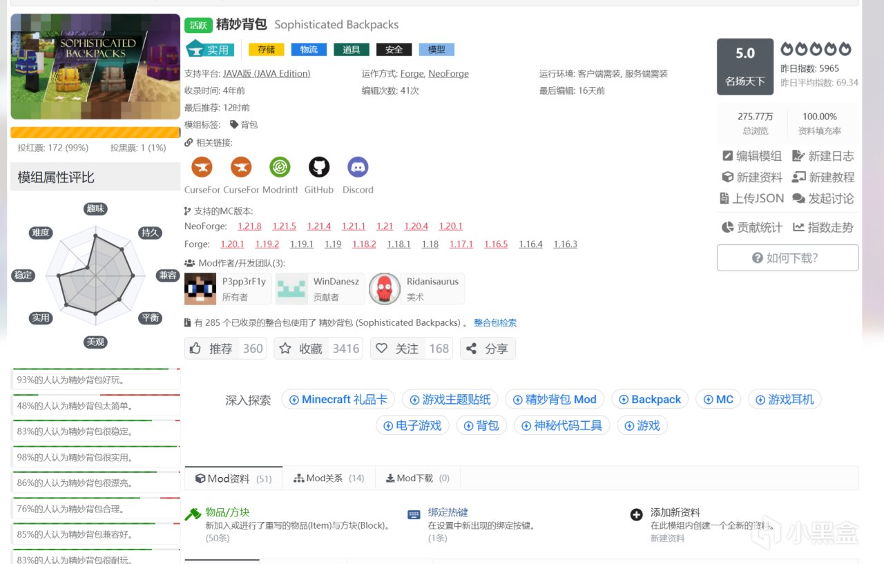 大家好,我是山河,今日的模组推荐为——精妙背包(Sophisticated Backpacks)