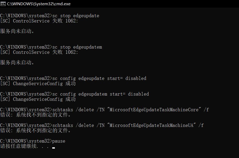 程序会自动执行,将Edge浏览器的更新开关关闭,并且删除本地的自动更新的文件,直接遏止后续自动更新的发生。