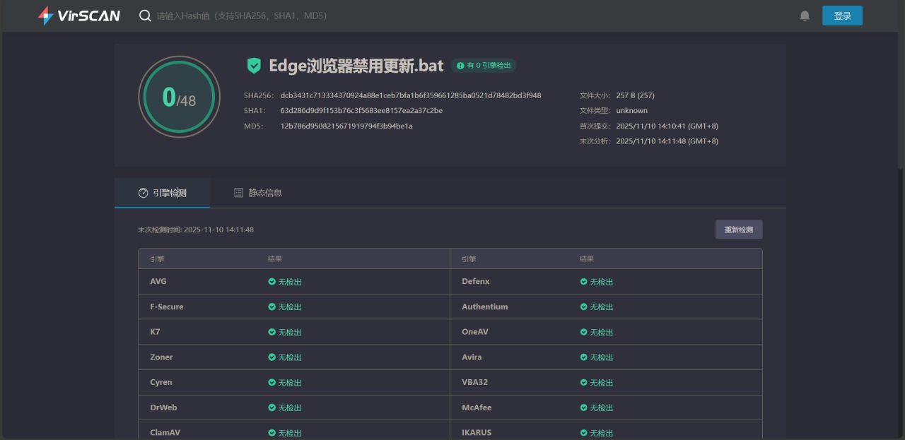 Edge浏览器禁用更新的bat命令已经经过VirScan在线病毒查杀,48个杀毒引擎均无检测出病毒和异常,放心实用。