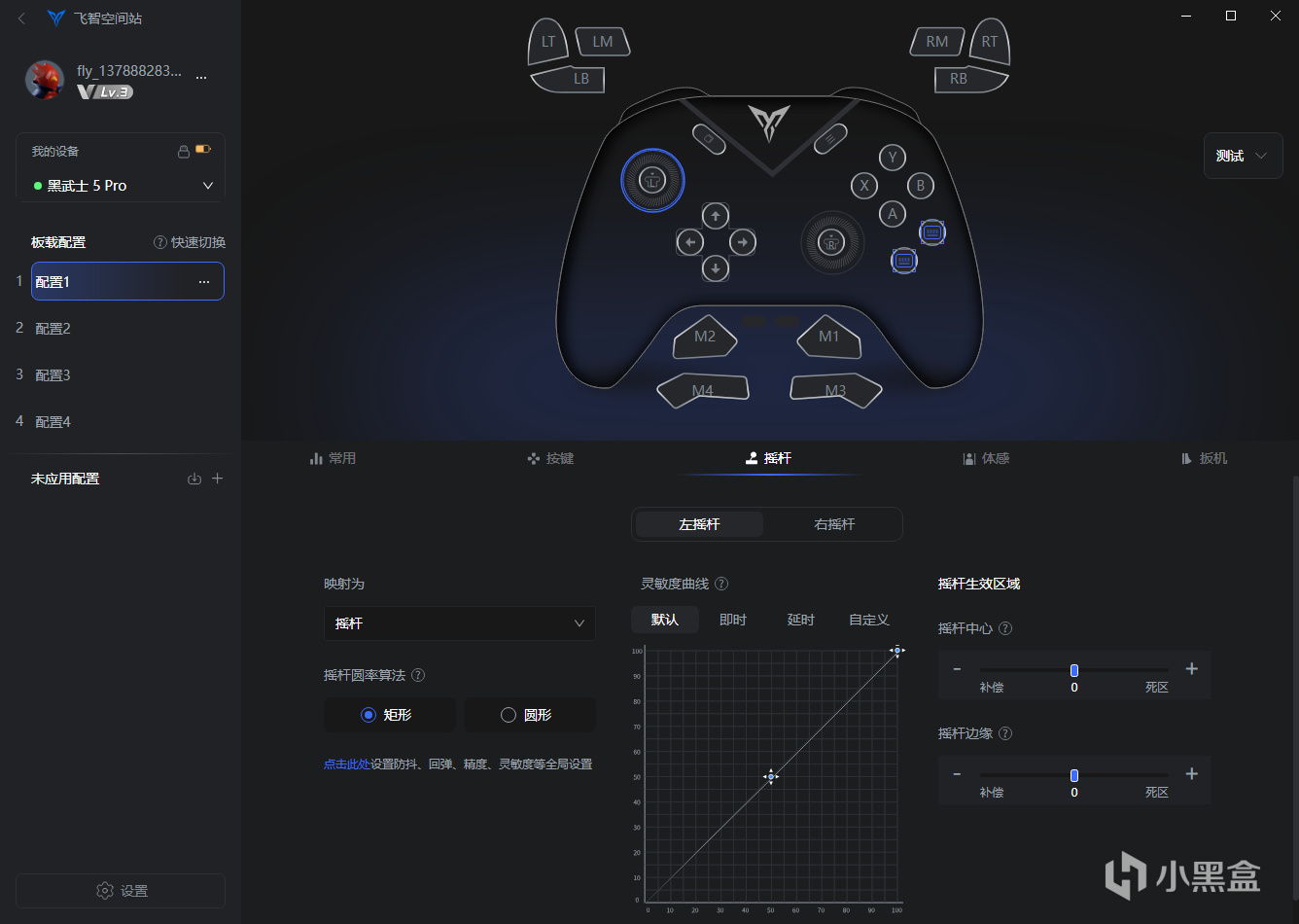 玩家还可以使用空间站为手柄进行功能调节,比如摇杆防抖、回弹算法等一系列较为专业的细节调控。飞智还贴心的在左侧的配置栏为玩家预设了四套游戏模式,方便玩家在游戏过程中切换。