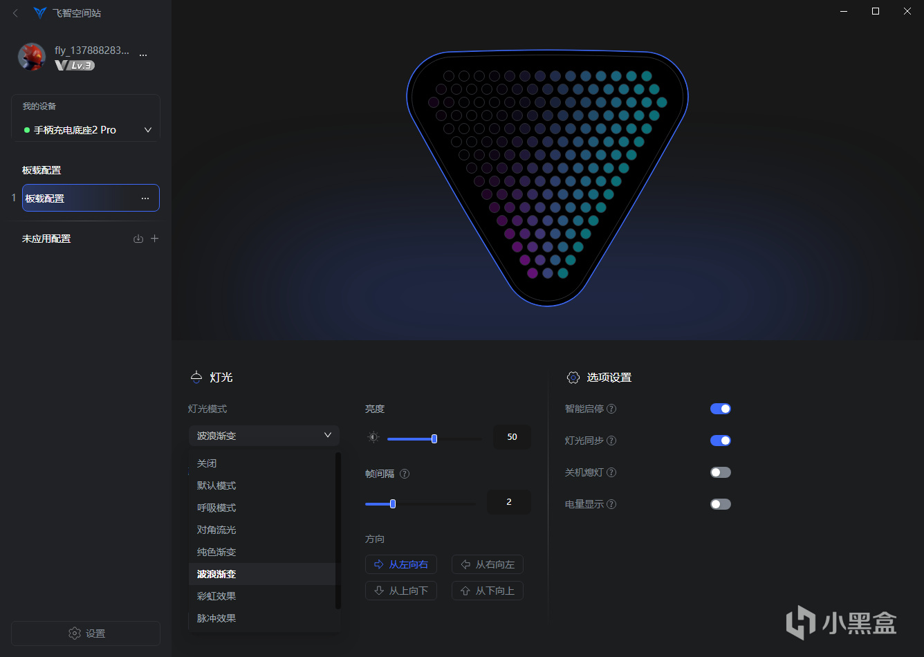 这个充电底座还可以自定义灯光模式,玩家可以根据不同使用习惯,设置智能启停或者充电时的RGB效果。