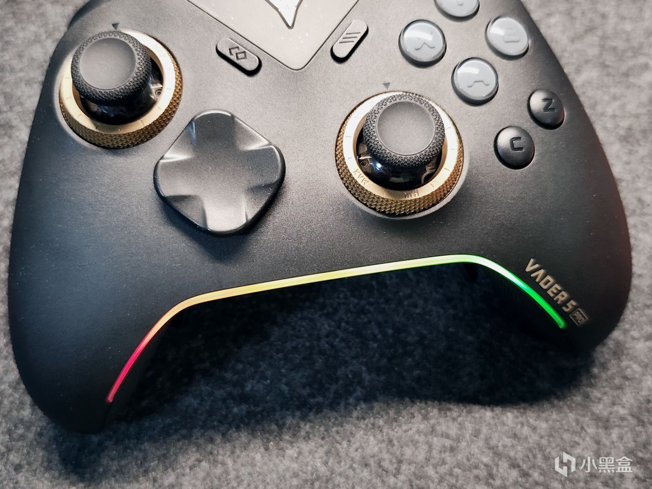 手柄右下方的握把处有着一排“VADER5PRO”的标识,不过这个标识只是单纯的贴图,摸上去并没有那种印记的铭刻感,可能也是期待有能力的玩家自己动手DIY吧。