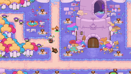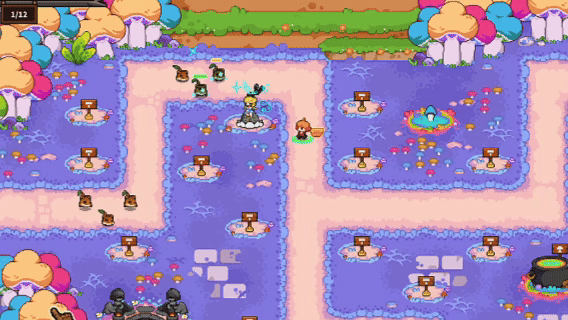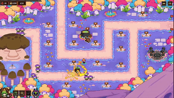 不再只是休闲点点点,而是需要满地图跑。每张地图都有一些独特的场景互动元素,在矿场烤面包赚钱(会召唤一个吐司怪),在菌苔林地采蘑菇炖汤(获得额外buff),在列车站台控制红绿灯召唤火车撞死沿线敌人。