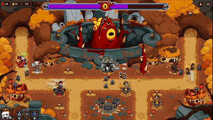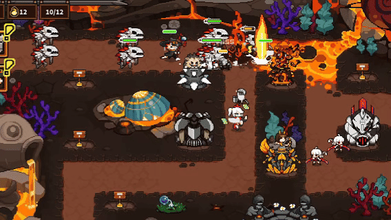 火山地图,敌人有护甲保护,需要击破蓝色水泡破甲。消耗能量点,呼叫冰霜减速、炸弹爆破、枪械狙击和天降金币等援助。游戏共5张地图23关,每个关卡各有一个挑战模式(只有3波怪物,通关解锁进阶防御塔)。宝宝、普通、困难和地狱四级难度调节,还有金手指自定义各种数值加成。
