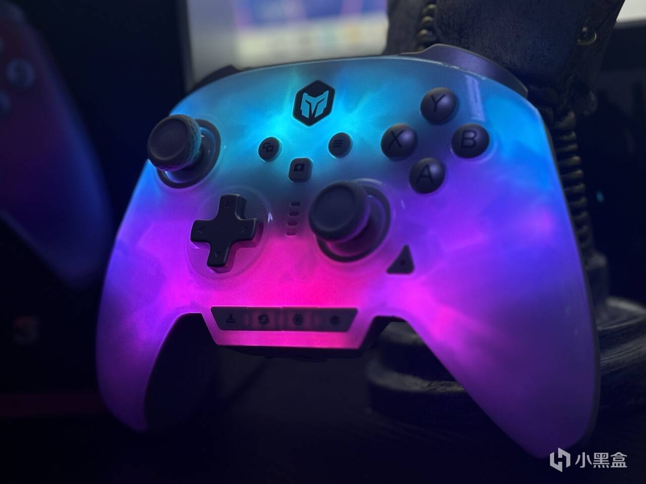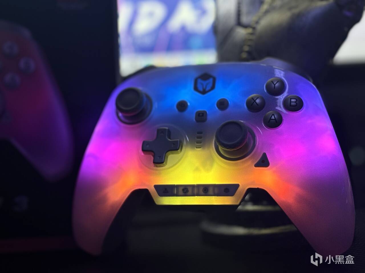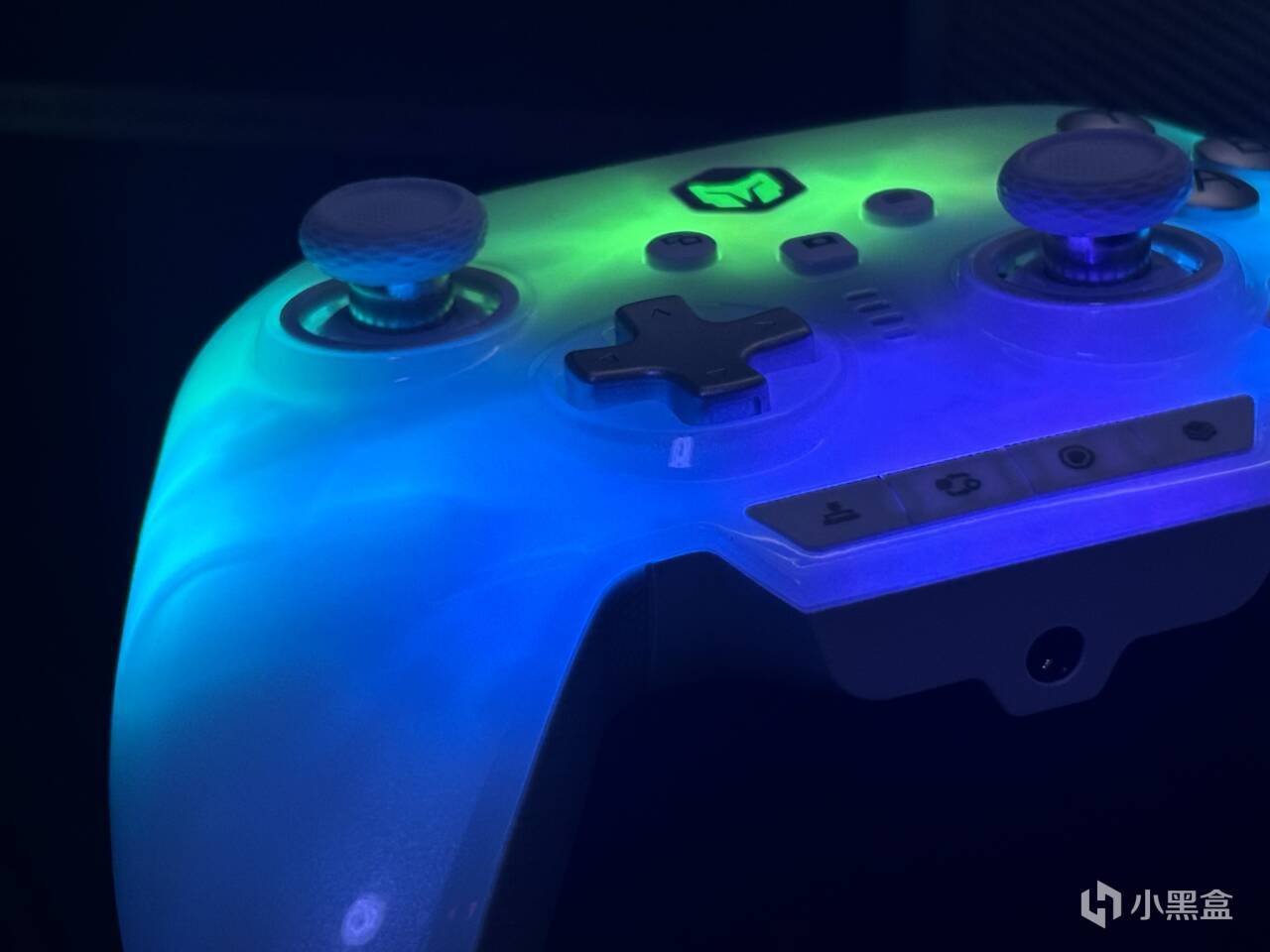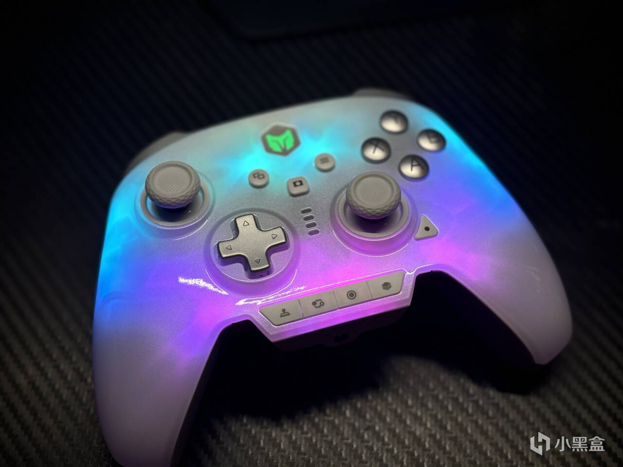 手柄在沒亮燈的時候,面殼是純白的,感覺有點像玉石,而亮燈之後,好傢伙!電競氛圍了解一下~,不過你別說,關上燈的房間用它打遊戲,電競氛圍直接就來了。14顆獨立RGB燈組,怪不得官網要搞彩虹造夢師呢!!有顏值它是真的露啊~