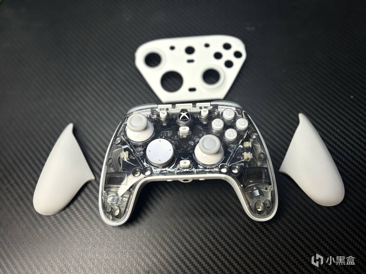 外觀就是非常標準的Xbox佈局,它的模具其實是根據G7改進而來面殼方面,是磁吸的設計,但是相比起一般手柄的磁吸面殼,它居然做了個分段處理,握把和主體的面殼是分開的,全部拆開之後,會看到內部透明的電路板,你別說,還挺帥的。