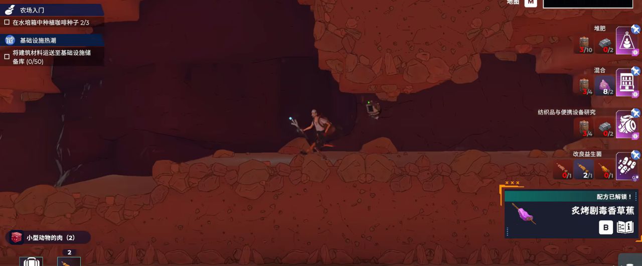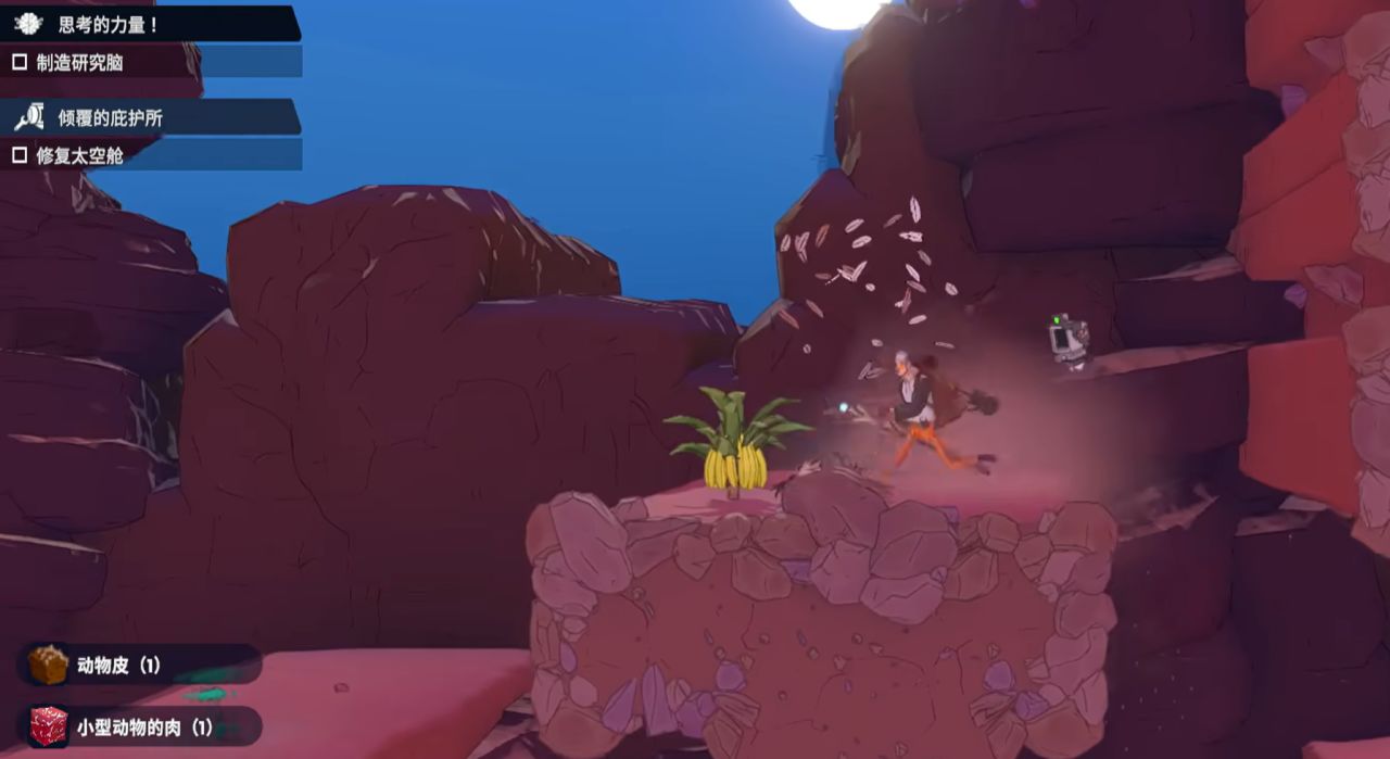比如锤击飞船残骸可以获得塑料还有飞船废料,敲击树木可以获得香草蕉、咖啡果、小树枝等等,甚至有些地方还有小鸟和小动物,我们可以直接狩猎它们,来获得肉和动物皮。