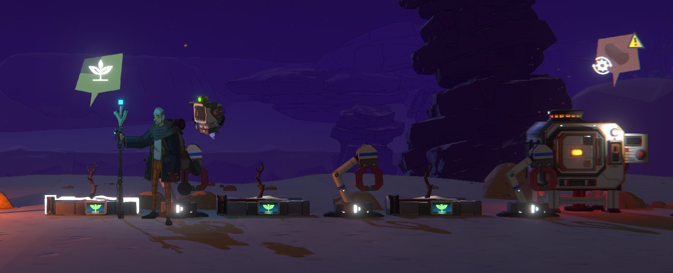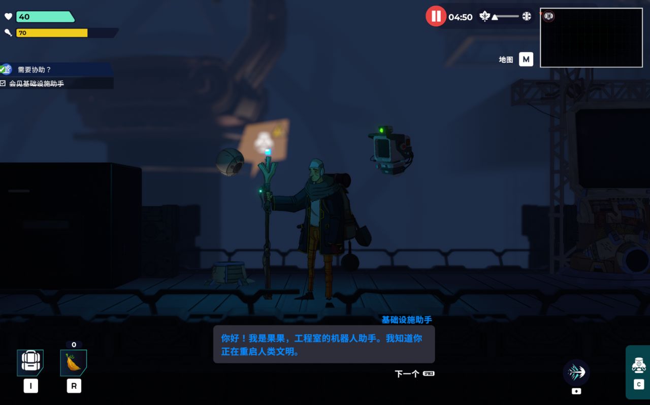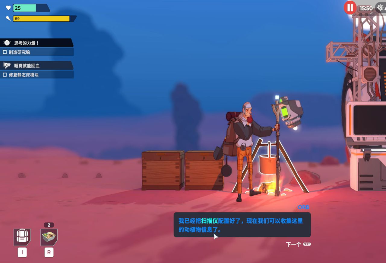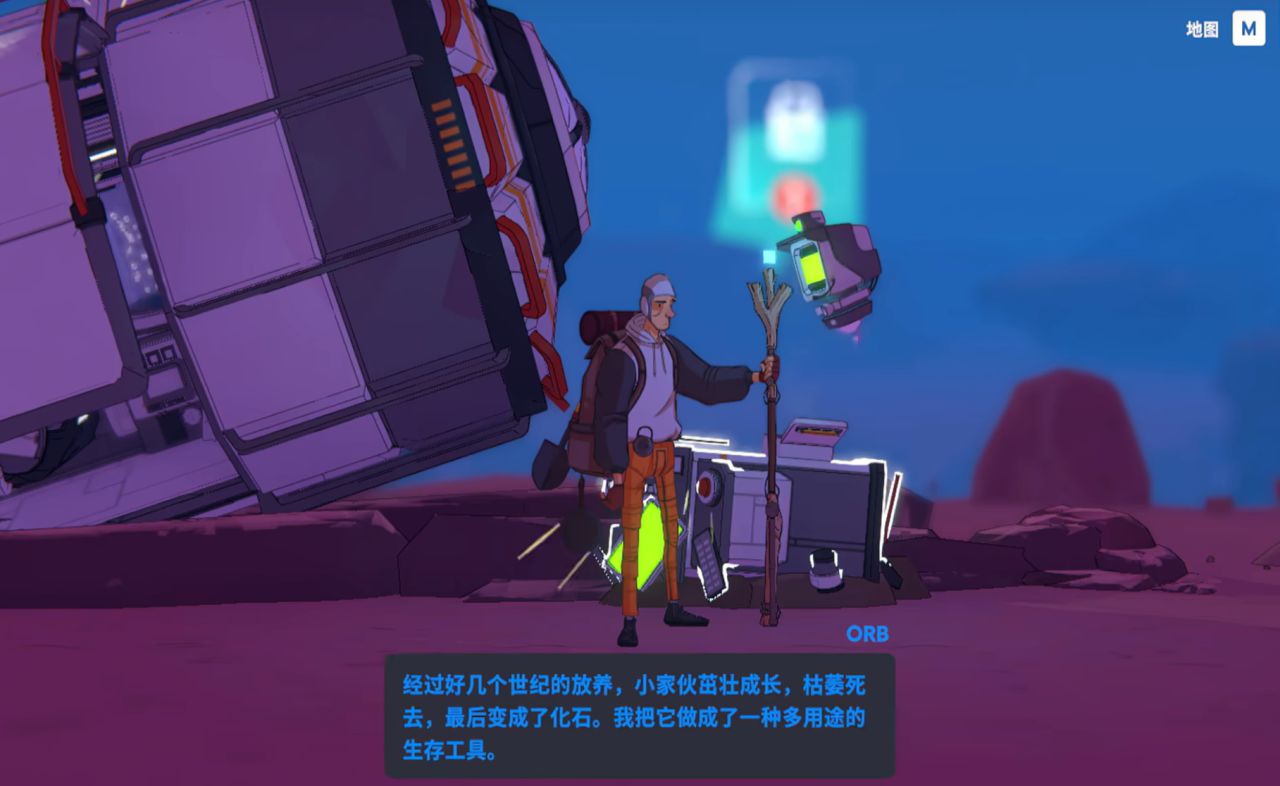 接着,我们拿到了一个用飞船上盆栽改造成的多功能拐杖,而这根棍子,还有我们的管家机器人ORB,就是我们开拓路上的左膀右臂。