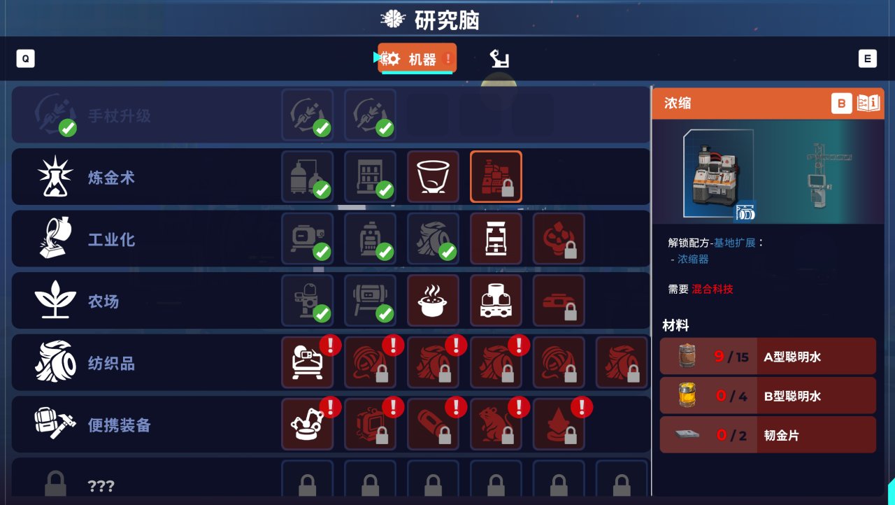 举个例子,我们用研究脑去研究的话,会需要“聪明水”,聪明水需要用2个咖啡豆研磨粉去合成,而2个咖啡豆研磨粉需要在研磨机里放4个咖啡豆,4个咖啡豆需要4个水培箱去栽培。
