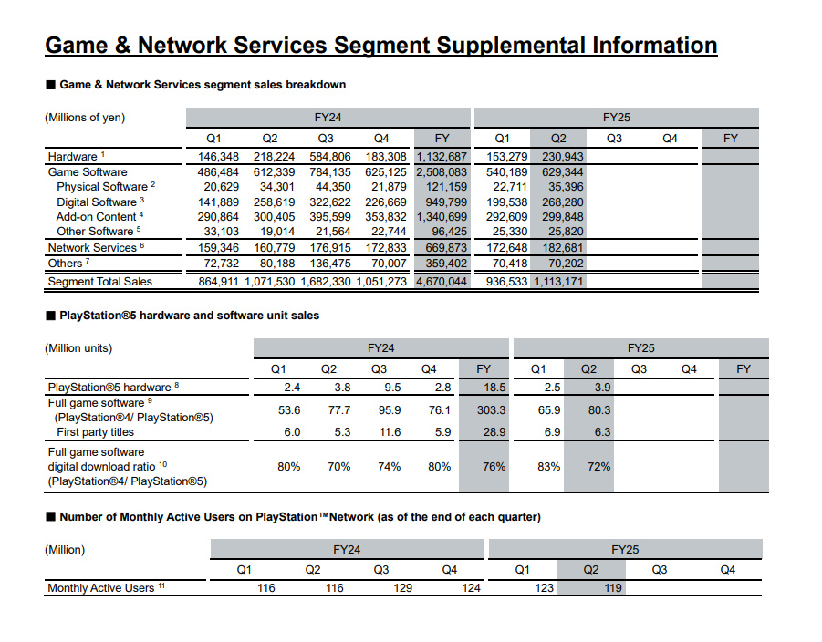 索尼今天公开了25-26财年第二季度的财务报告,透露了PlayStation业务的几项关键指标,以下是本次财报的主要内容(统计时间为7月1日至9月30日):
