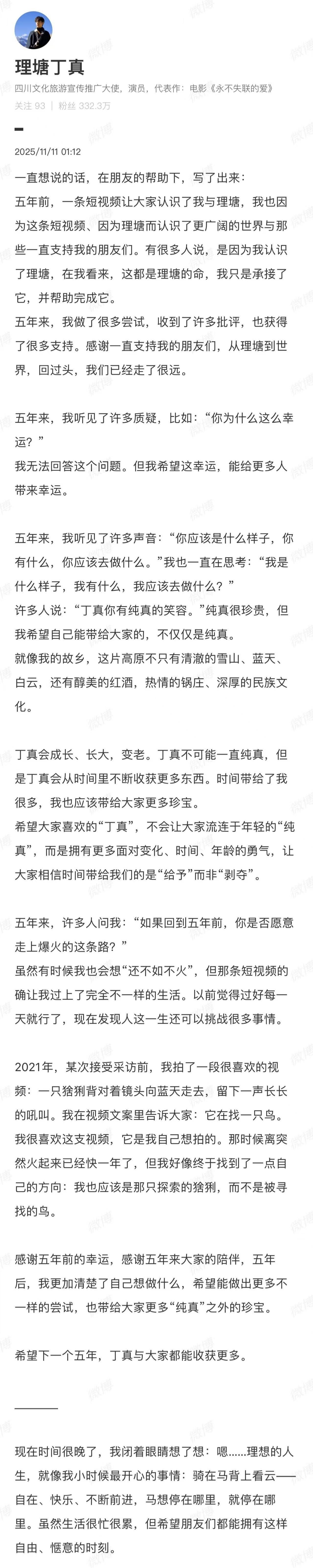 11月11日凌晨,丁真在社交平台发表出道五周年长文,直面“纯真”标签,坦言“丁真会成长、长大,变老。丁真不可能一直纯真”。这名24岁的青年希望支持者能从他身上获得面对时间与变化的勇气,而非流连于固定的“纯真”印象。