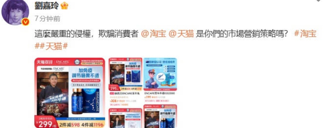 近日演员刘嘉玲在社交平台公开喊话淘宝和天猫。她晒出淘宝界面截图,指出一家名为“ENCARE海外旗舰店”的店铺在其销售的“新西兰ENCARE耳牛免疫球蛋白”商品首页使用了梁朝伟的半身照片。