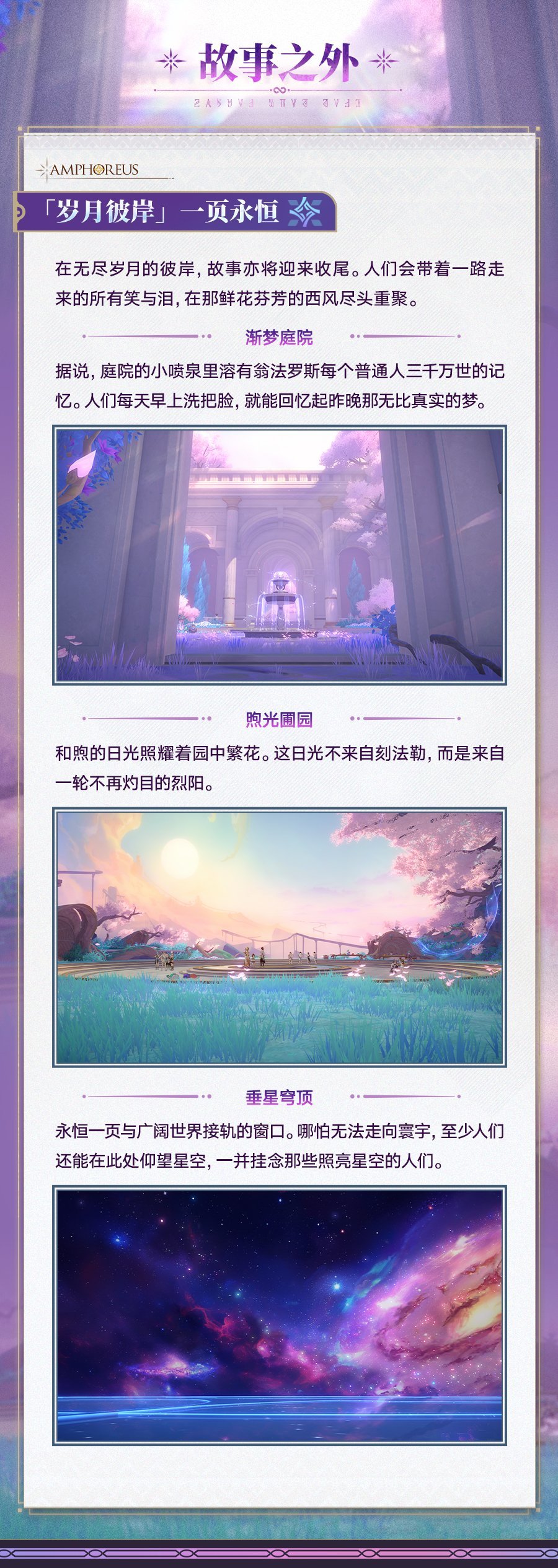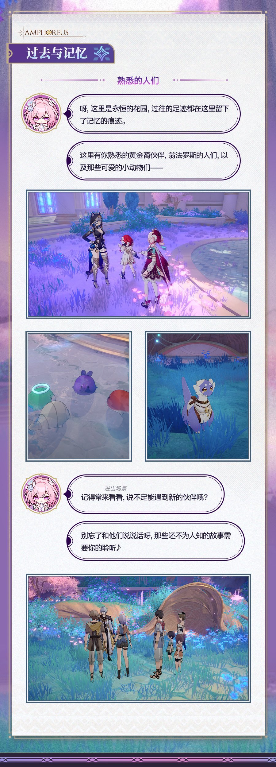 这片永恒的花园里,留存着过往足迹的记忆,有黄金裔伙伴、翁法罗斯的人们与小动物们,也期待着新伙伴的相遇。