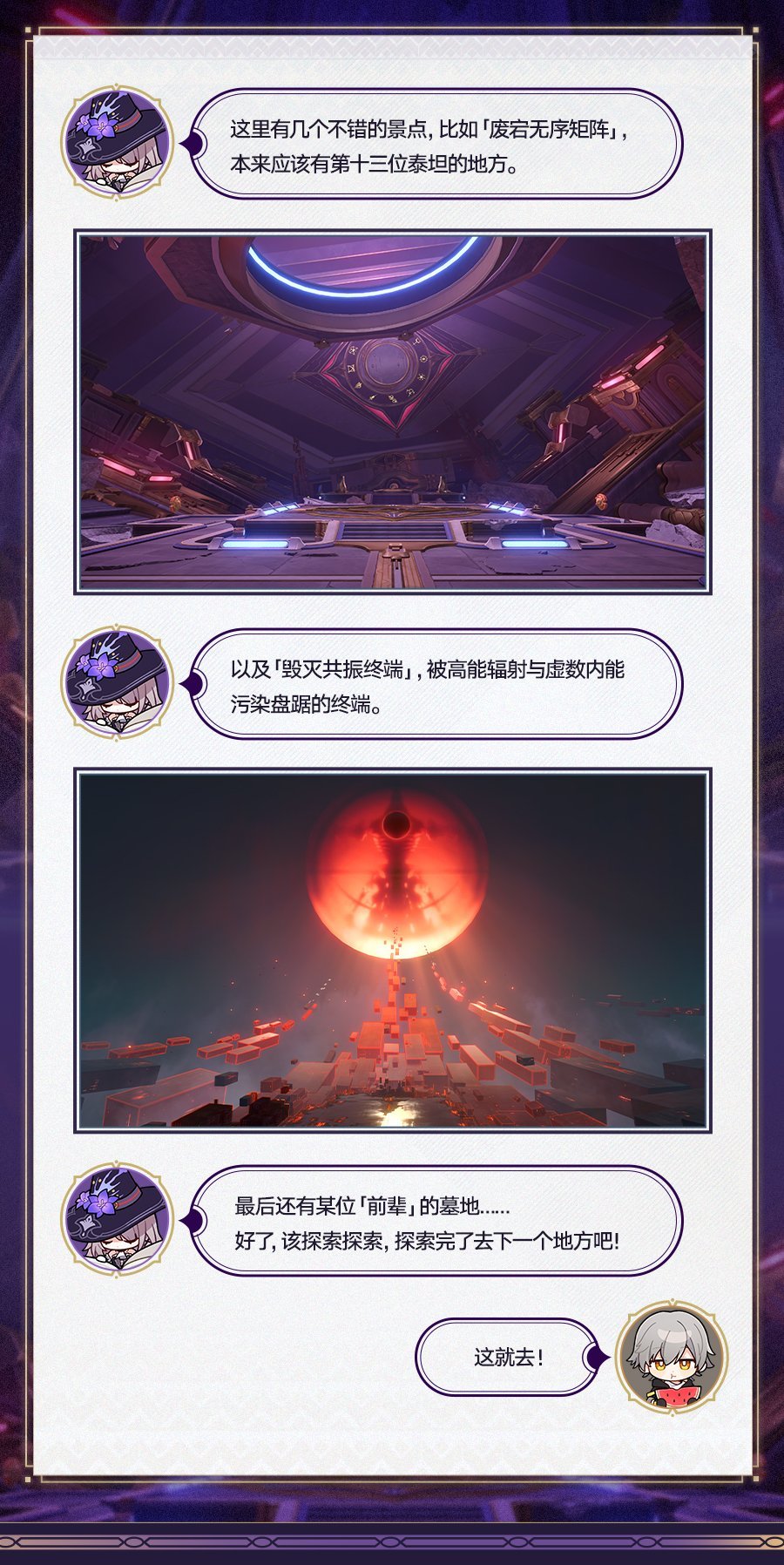 “废宕无序矩阵”本是第十三泰坦的位置;“毁灭振终端”被高能辐射与虚数内能污染;还有某位“前辈”的墓地。