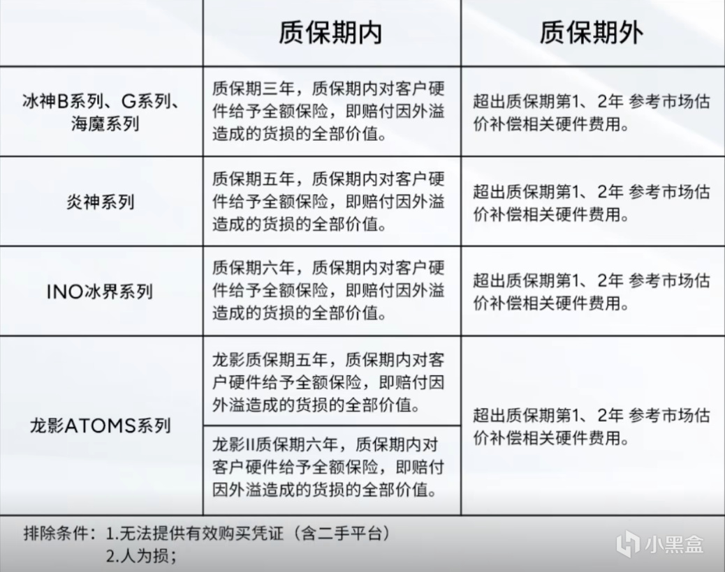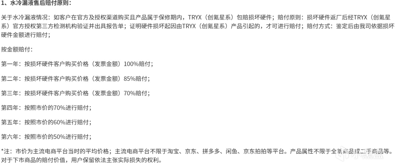 第 4-6 年:当前市价的 70%、60%、50%(例:1 万元主机第 6 年若市价仅 3000 元,仅赔付 1500 元,可能低于水冷本身价格)后面损耗价同样意思