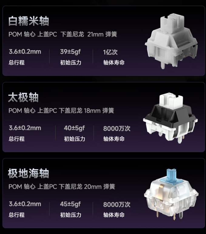 太极轴与极地海轴:太极轴回弹偏软,适合不追求强回弹的用户;极地海轴触发压力最大,适合“金刚指”玩家。