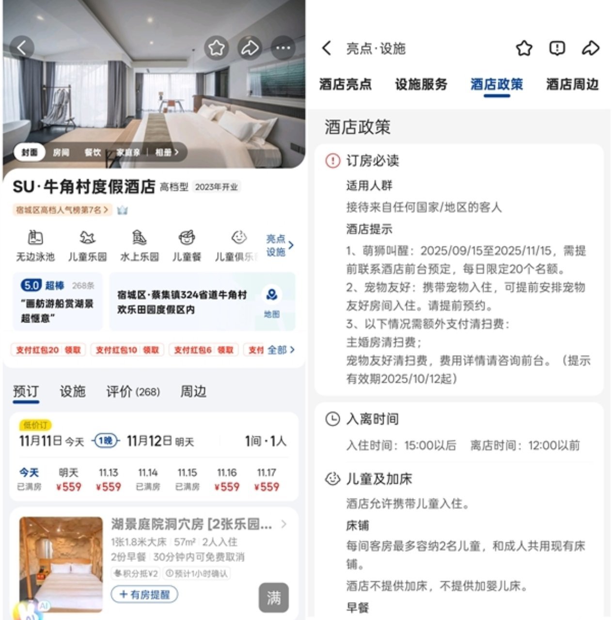 江苏宿迁市牛角村欢乐田园度假区推出“萌狮叫醒”特色服务,吸引众多游客关注。这项服务定价为628元一晚的房型,包含小狮子进入客房互动、餐饮任选和亲子乐园畅玩等项目。