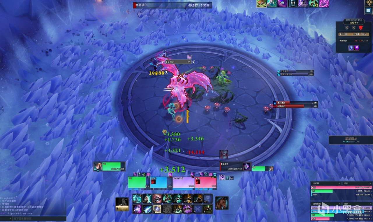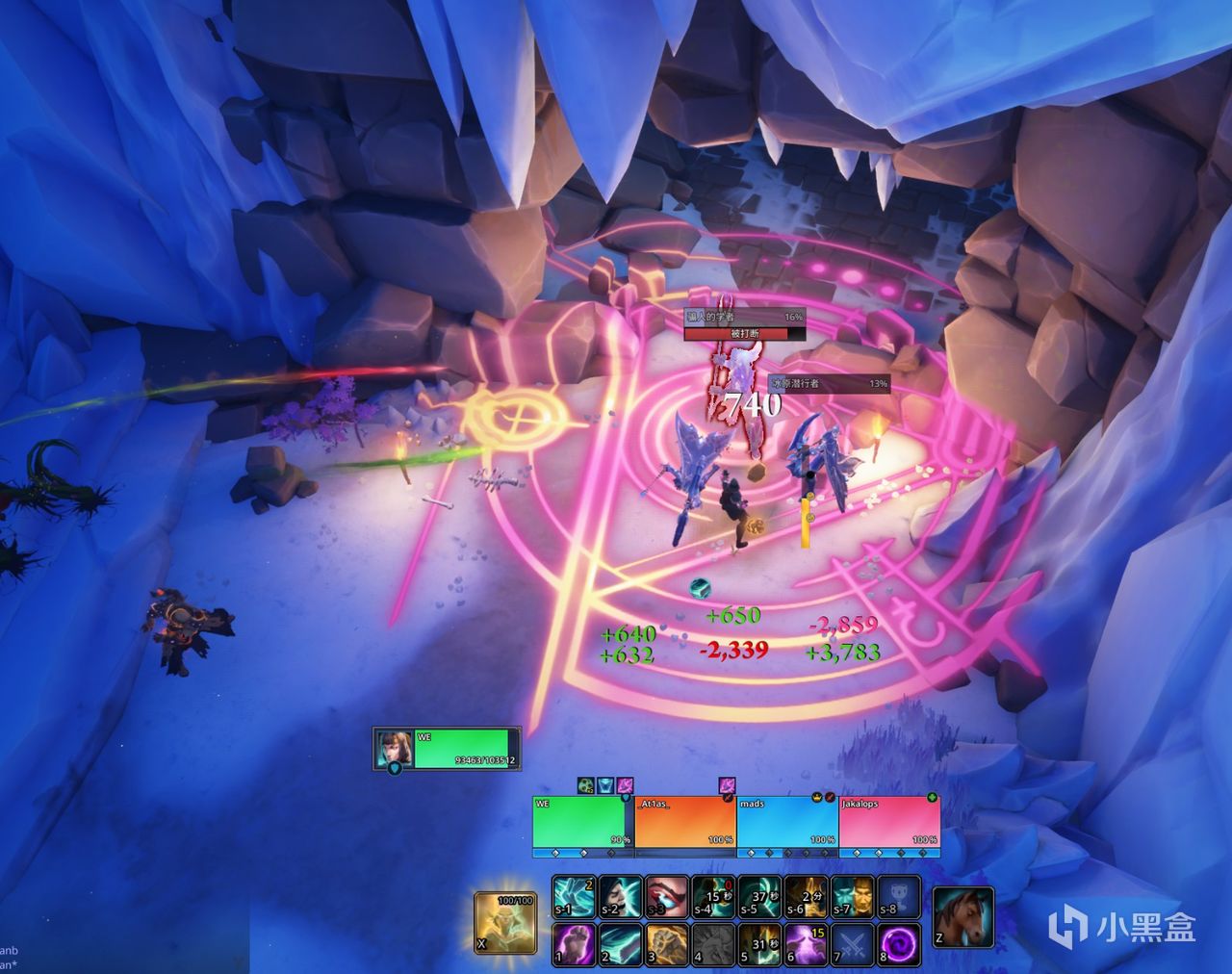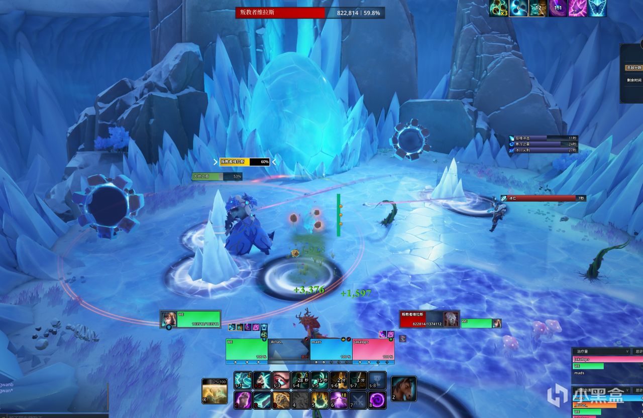 领主2—远古科罗斯:最难处理的一个BOSS,需要注意它的特殊机制。在施放锁定技能范围冰锥时,被锁定目标应迅速调整方向,将自己的攻击方向引到和场中小行星【动荡宝珠】相同的位置,引导BOSS的冰川攻击在打击自己的同时,也震碎掉那些紫色球体。